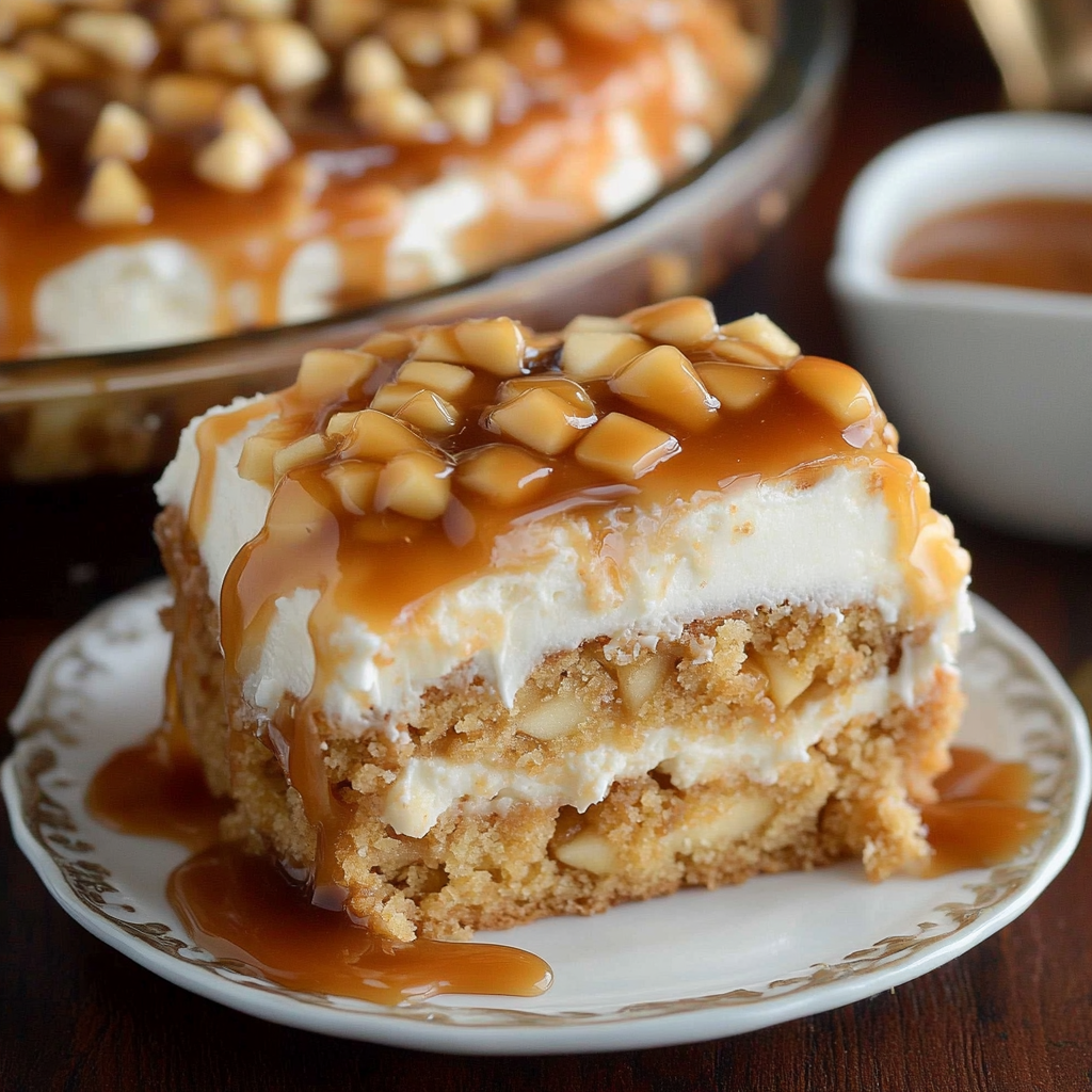 Experience the delightful fusion of flavors in this Caramel Apple Toffee Cake, a decadent dessert that combines sweet apples, rich caramel, and crunchy toffee. This poke cake is perfect for any occasion—from cozy family dinners to festive gatherings—guaranteeing that everyone will be asking for seconds. Its moist texture and luscious whipped cream topping make it an unforgettable treat that satisfies even the strongest sweet cravings.