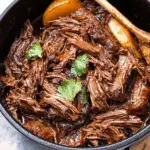 - Return shredded beef to the thickened sauce and serve over rice or in tacos.