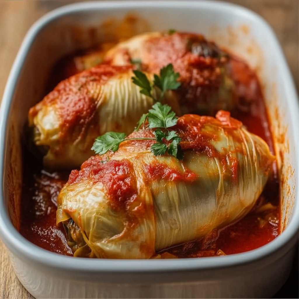 Classic Polish stuffed cabbage rolls, known as Gołąbki, featuring tender cabbage leaves filled with a savory mixture of seasoned ground meat and rice, simmered in a rich tomato sauce.