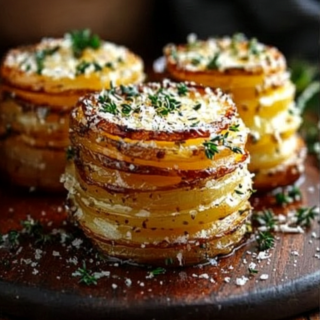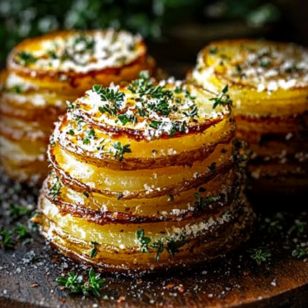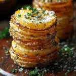 Elevate your dining experience with Roasted Garlic Parmesan Potato Stacks, a stunning side dish that delights both the eyes and palate. These savory stacks feature thinly sliced russet potatoes infused with aromatic garlic, layered with rich Parmesan cheese, and baked to crispy perfection. Ideal for any occasion, they are not only easy to prepare but also versatile enough to complement a wide range of main dishes. Impress your guests with this visually appealing and delicious recipe that brings comfort and elegance to your table.